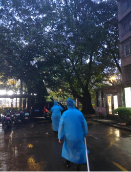 留守管理處值夜班的主任葉昌華、夏隊長,對講機里不時傳來報告:B區(qū)3棟旁一棵樹枝斷了、B區(qū)6棟前斷了一根樹枝、A區(qū)5棟一棵大樹刮倒了.......。臺風“蘇拉”逃離后,葉主任、夏隊長帶領值班的隊員,穿著雨衣、拿著工具趕赴現(xiàn)場,清理阻礙道路通行的樹枝。夜間,雖然溫度較低,風也大,但他們?nèi)员挥晁?、汗水濕透一身,干得歡而帶勁!